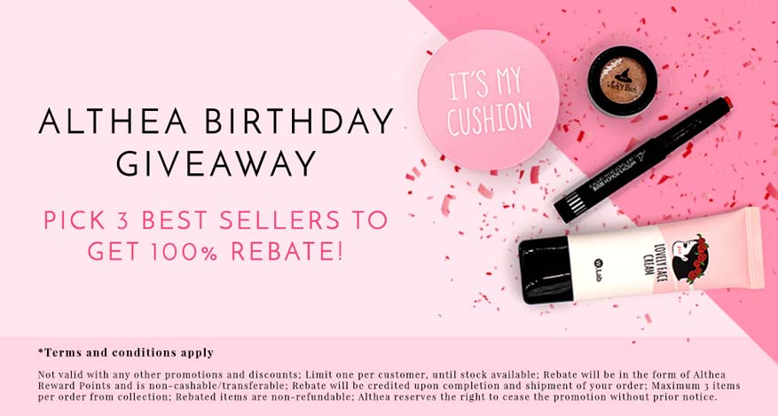 The highlight that I love so much, Althia Birthday Giveaway, just pick 3 best sellers and get 100% rebate! Rebate will be credited into your account.