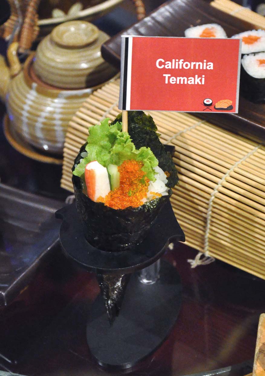 Specially prepared by Chef Muhd Rizza, the wide range of sushi types that are available including Makimono Sushi, Temaki Sushi, Nigirisushi and Hosomaki Sushi, expect to be spoilt with California Maki, Tori Katsu Maki, Soft Shell Crab Maki, Cili Padi Tuna Mayo Maki, Agehan Temaki, Tamago Temaki, Tobikko Temaki, Shake Sushi, Grill Shake Sushi, Maguro Sushi, Chuka Idako Sushi, Unagi Maki, Avocado Maki and other Sushi to be endeavored.