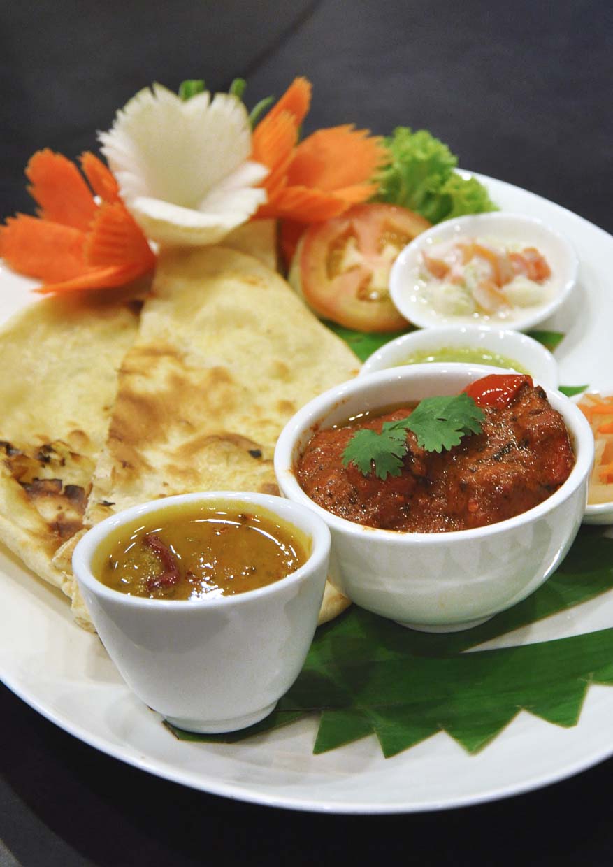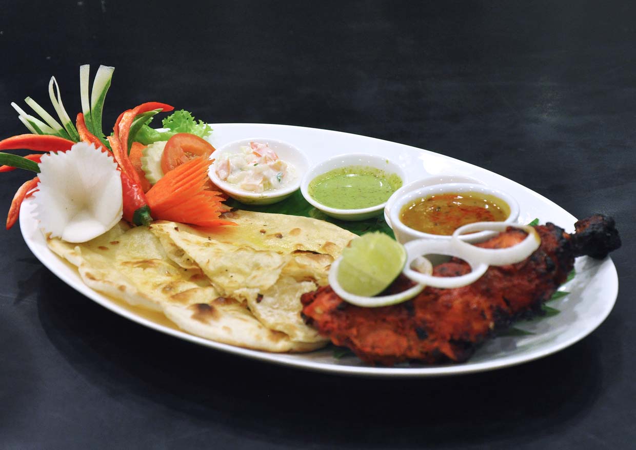 Tender Tandoori Chicken served with fresh Naan Bread and condiments, which include delicious Northern-styled dhall gravy, vegetable raita, special herbs and mint sauce, as well as chutney.