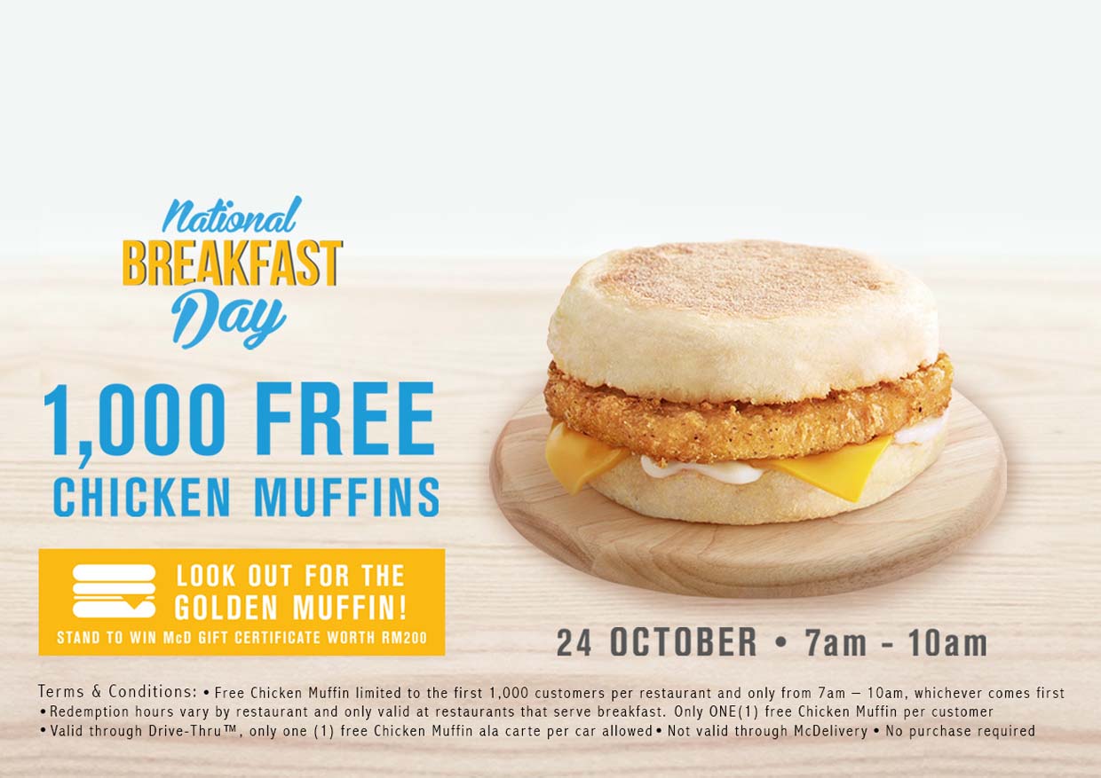 McDonald’s National Breakfast Day is back! There will be 1,000 Chicken Muffin giving away free from 7 am to 10 am.